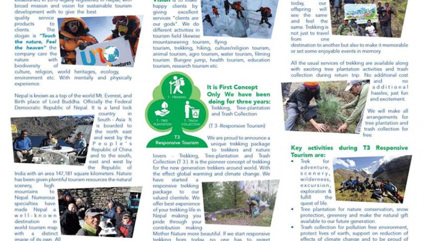 We are proud to announce a unique trekking package for trekkers and nature lovers - Trekking, Tree-plantation, and Trash Collection (T3). It is the pioneering concept of trekking for the new generation of trekkers around the world. With the effect of global warming and climate change, our trekking destinations are being degraded day by day not only due to the natural consequences but also due to our non-responsive behavior toward our hidden treasures. We care so our coming generation would be able to taste the precious natural gifts.
